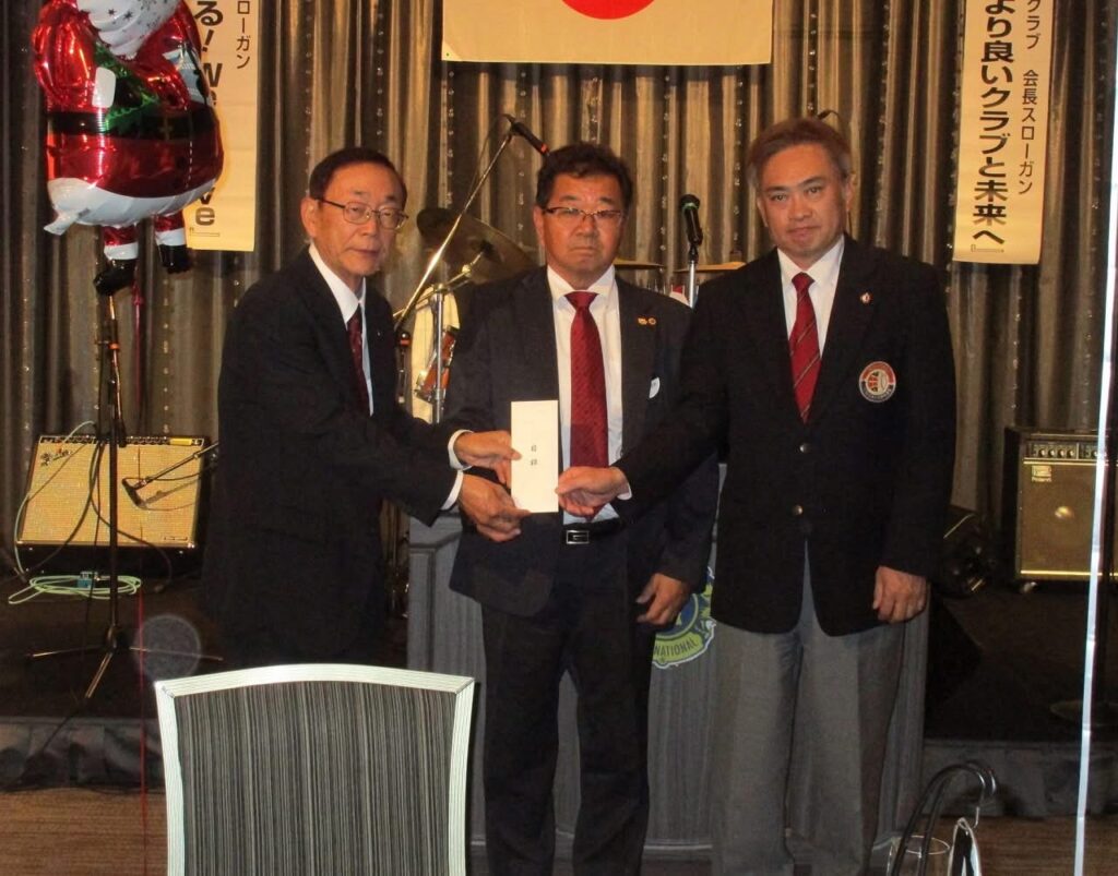 2025年12月19日、ホテルアークリッシュ豊橋にて「第1634回年末家族例会」開催し、会長及び前ガバナーの挨拶後に、豊橋市社会福祉協議会様に歳末義援金10万円の贈呈と先に行われた少年野球の選手達の街頭募金を豊橋善意銀行に10万円と小児がん基金として19万円を贈呈しました。例会後には第2部懇親会で還暦グループのロックバンド演奏や会長サンタからのプレゼントに抽選会が行われ理事会メンバーからの商品が抽選され、1等賞はズワイガニでしたが、家族との懇親会を楽しみました。